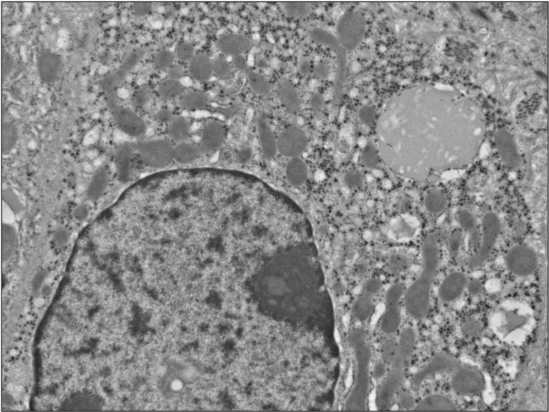 - Almost complete loss of peroxisomes with rare questionable small-sized ones
