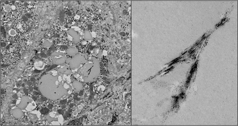 - Early trilamellar inclusions (two dark thin linear lines and a line of lucency between them) within the fat droplets