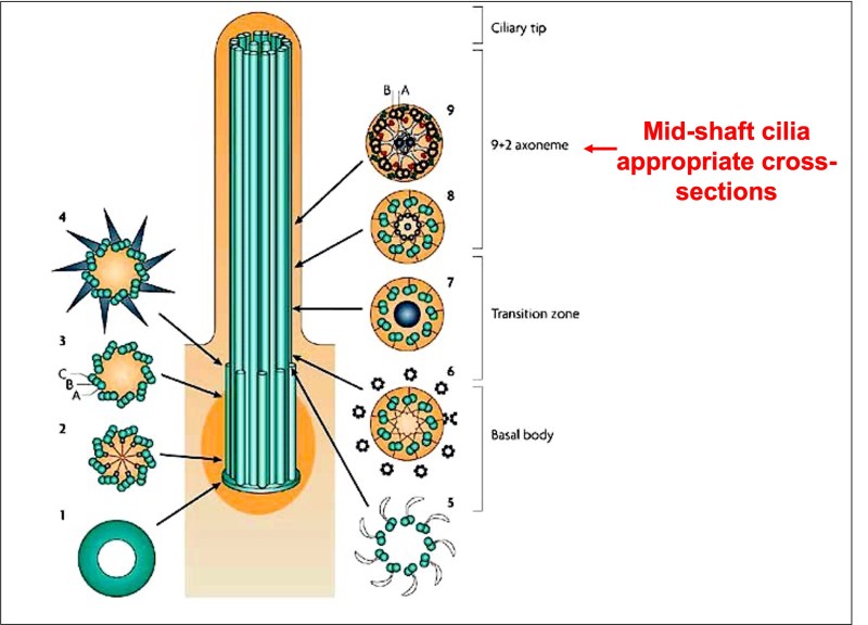 - Cilial ultrastructures are only evaluated on good cross-sections of mid-shaft cilia.